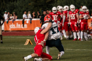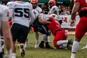 Hatten sich die ifm Razorbacks Ravensburg einen Plan für die zweite Halbzeit gemacht, wurde dieser bereits im ersten Versuch zunichte gemacht. Den Passversuch von Spielmacher Broghean Mcgovern, abgefälscht durch die Hand eines Braunschweiger Verteidigers,