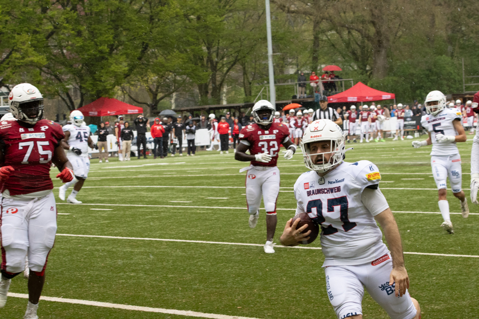 Auch im zweiten Quarter behielten die Lions die Kontrolle. Ein Touchdown-Lauf von N. Bünger baute die Führung weiter aus, bevor Hamburg noch einmal verkürzen konnte. Doch erneut hatte Braunschweig die passende Antwort: Thomas fand Kusterer zum nächsten Touchdown-Pass.
